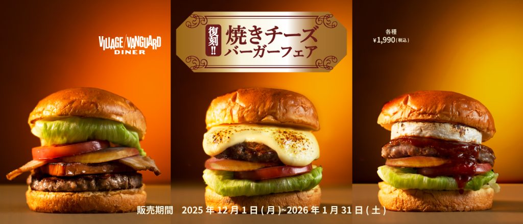 グルメハンバーガー専門店「ヴィレッジヴァンガードダイナー 」は、「復刻!!焼きチーズバーガーフェア」を2025年12月1日より期間限定で開催します。
